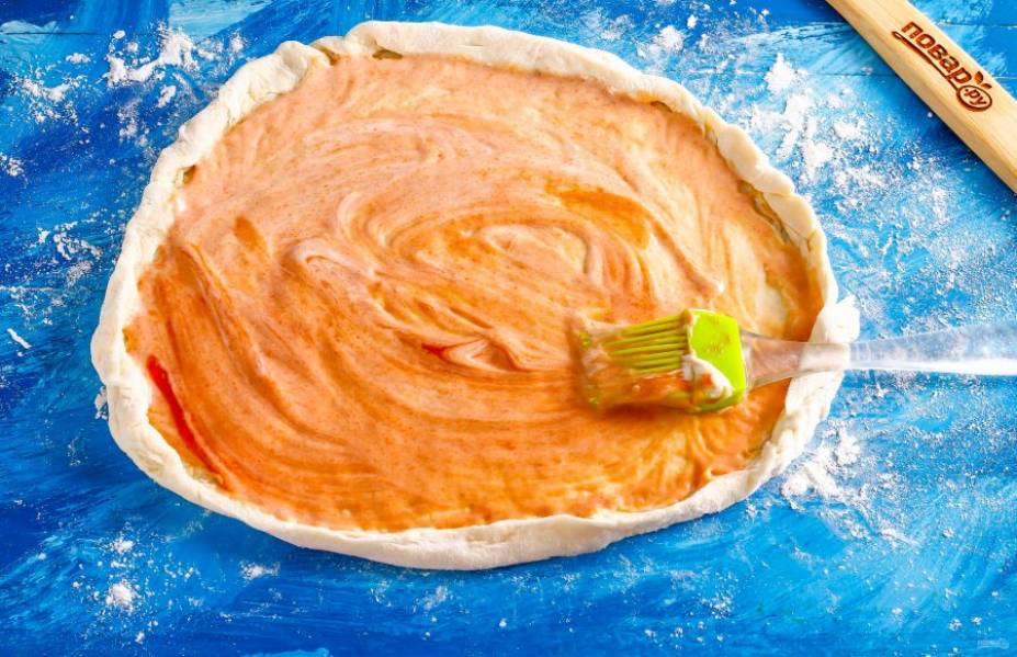 Затем тесто раскатайте в округлый или овальный пласт, подпыливая рабочую поверхность мукой. Сформируйте бортики и смажьте середину заготовки майонезом и кетчупом.