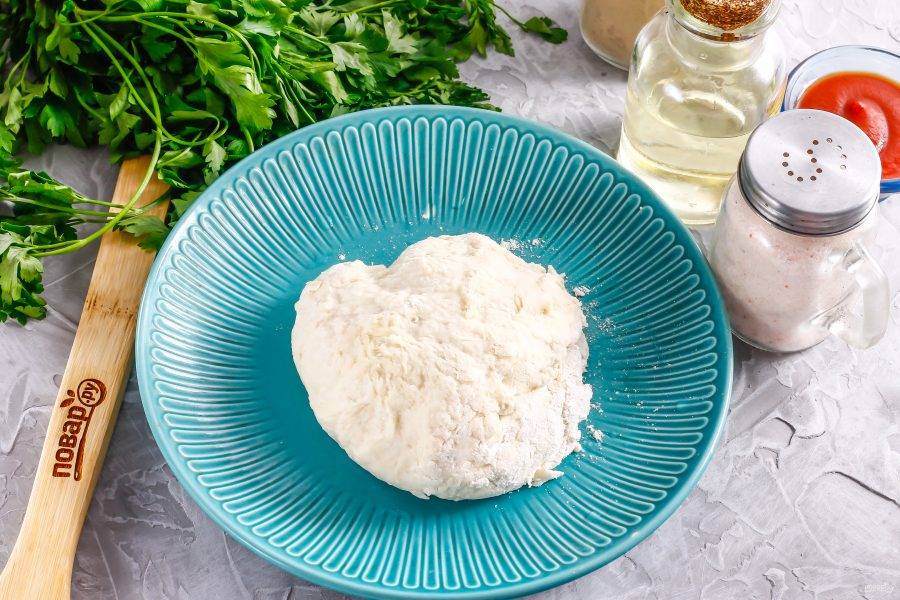 Замесите плотное тугое тесто и накройте его полотенцем, оставьте на 15 минут.