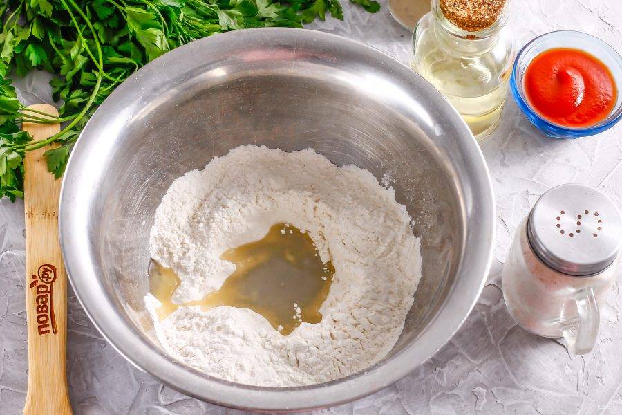 Всыпьте в глубокую емкость просеянную пшеничную муку и сделайте в ней углубление. Влейте туда теплую воду, растительное масло и всыпьте 2 щепотки соли.