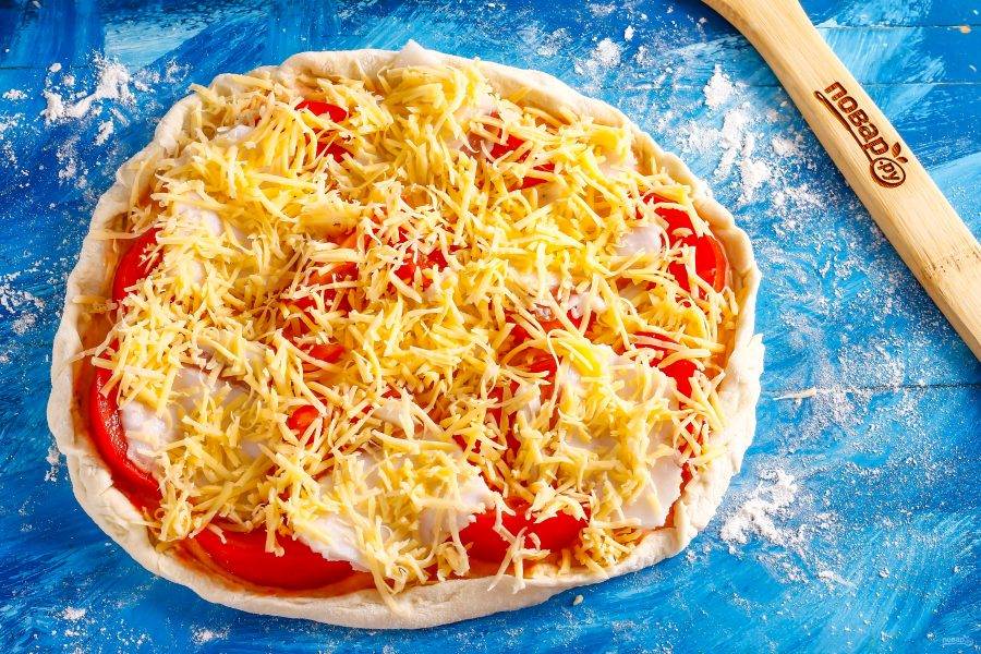 Твердый сыр натрите на терке с мелкими ячейками. Присыпьте им всю заготовку. Разогрейте духовку до 200 градусов и поместите в нее заготовку пиццы.