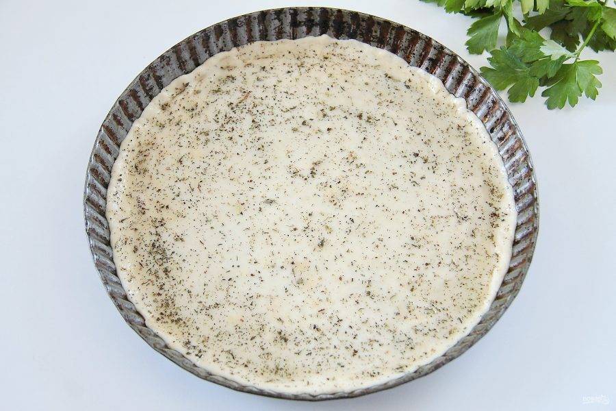 7. На слегка покрытой мукой поверхности раскатайте тонко тесто до желаемого размера и аккуратно перенесите в форму, предварительно смазав ее маслом. Руками сформируйте небольшие бортики. Смажьте поверхность оставшимся оливковым маслом, смешанным с прованскими травами.