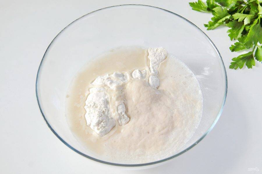 3. В глубокую миску просейте муку, добавьте соль и подошедшие дрожжи.