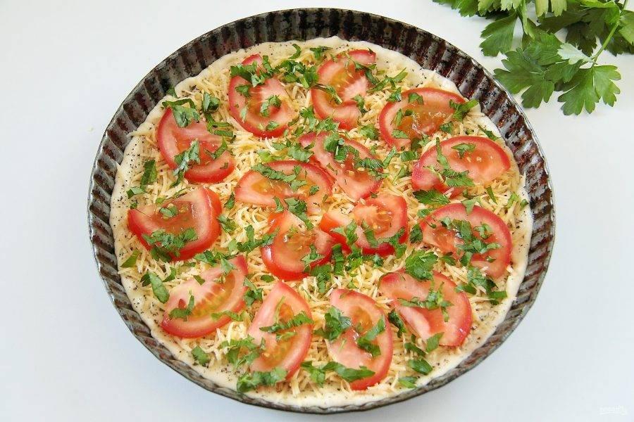9. Сверху равномерно распределите нарезанный тонкими дольками помидор и посыпьте измельченной петрушкой.