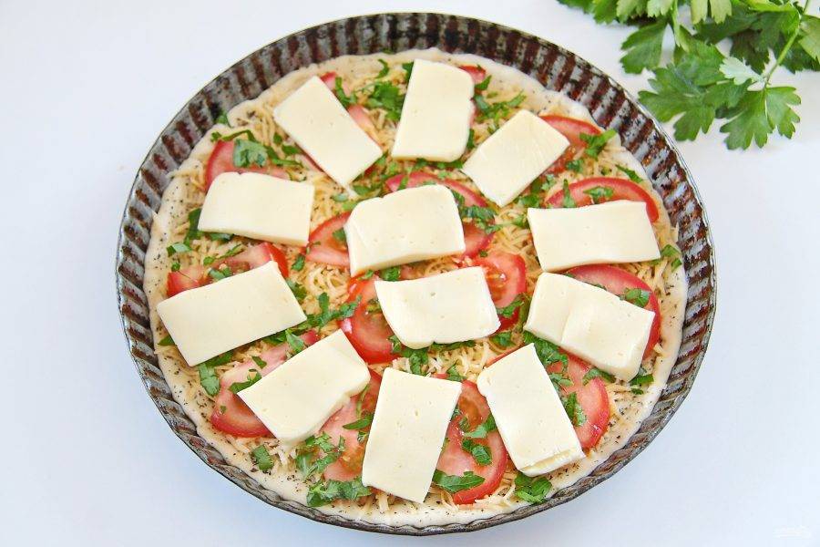 10. На помидоры выложите оставшийся сыр. У меня была моцарелла, я просто тонко ее нарезала и равномерно разложила сверху.