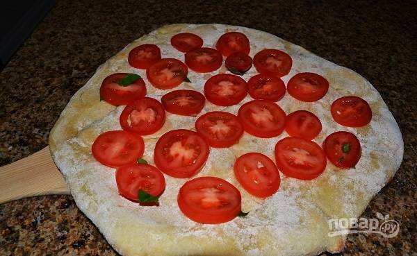 3. Помидоры вымойте, обсушите, нарежьте тонкими кружочками и выложите на корж.