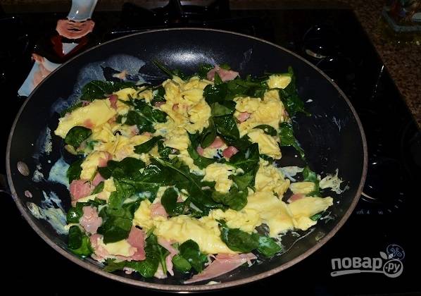 2. Тем временем растопите сливочное масло на сковороде. Выложите ветчину и вымытый шпинат, вбейте яйца. Тщательно перемешайте все и обжарьте на среднем огне.