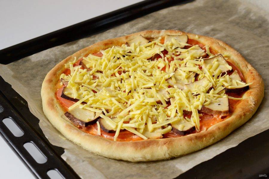 Натрите сыр на крупной терке, посыпьте им пиццу и отправьте в духовку еще на 10 минут.
