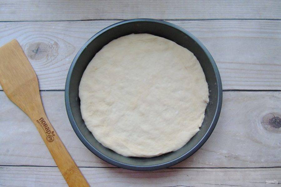 Через час тесто увеличится в объеме в 2-3 раза. Достаньте его из миски, обомните и разделите на три части по количеству пирогов. Одну часть раскатайте и выложите в форму для выпекания.