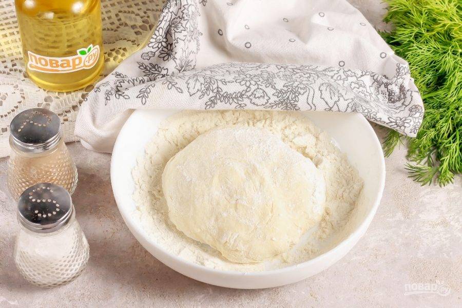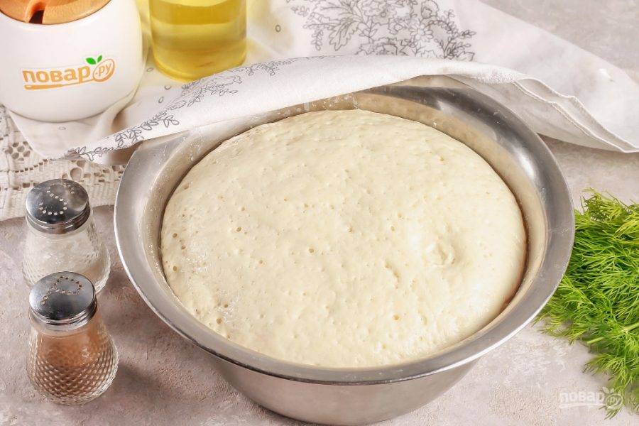 Воду прогрейте до 30 градусов, чтобы она не обжигала ладонь. Влейте ее в глубокую емкость, вмешайте в воду соль и дрожжи, затем — половину пшеничной муки. Накройте емкость полотенцем или салфеткой и оставьте на 15-20 минут, чтобы выросла опара.