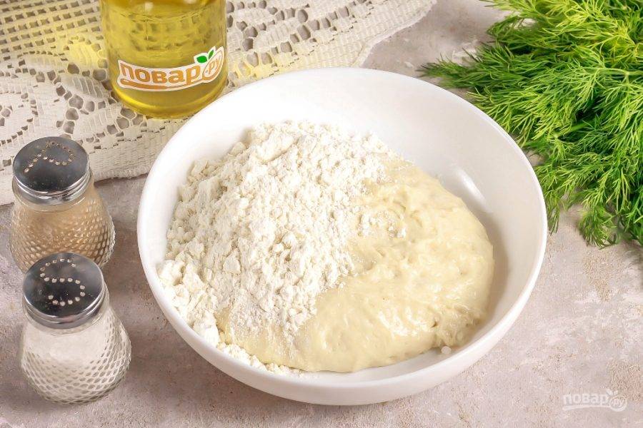 Обомните опару, она быстро сдуется и выложите ее в миску. Добавьте еще пшеничной муки. По желанию в этот момент можно влить 2 ст.л. растительного масла без аромата и добавить молотые пряные травы.
