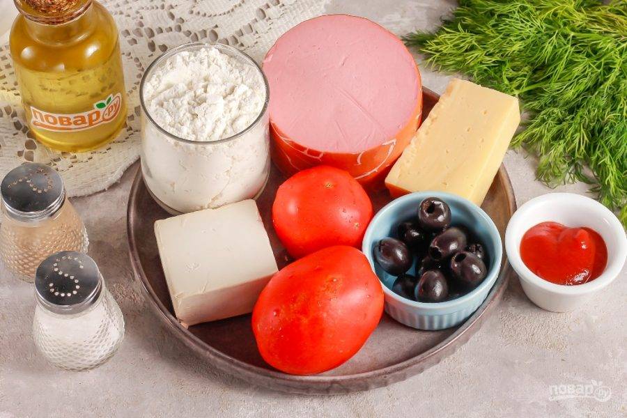 Подготовьте указанные ингредиенты. Колбасу и сыр можно использовать любого сорта.