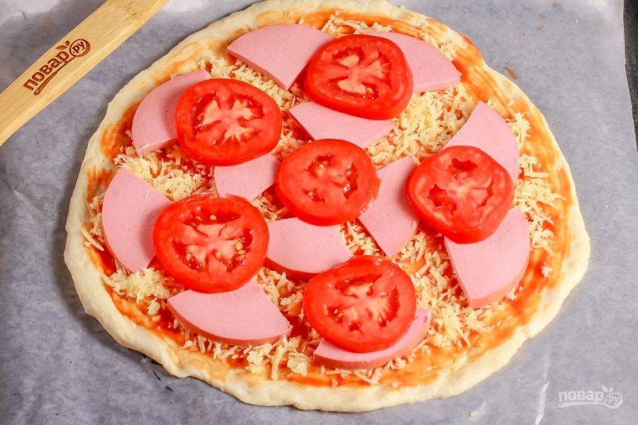 Приготовленное тесто накройте полотенцем или салфеткой и оставьте на 10 минут в покое, оно должно вырасти в размерах вдвое. Пока тесто доходит, натрите твердый сыр на терке, колбасу нарежьте кружочками или четвертинками, а помидоры — ломтиками.