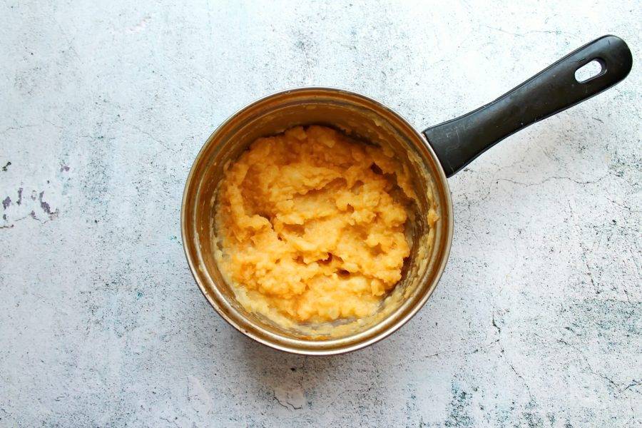 Репу тщательно вымойте, очистите от верхнего слоя и порежьте на кусочки. Выложите ее в кастрюлю и залейте водой, варите на среднем огне до полуготовности. Помните ее до желаемого состояния, но лучше, если останутся небольшие кусочки.