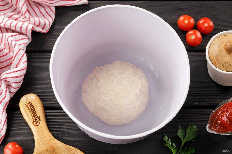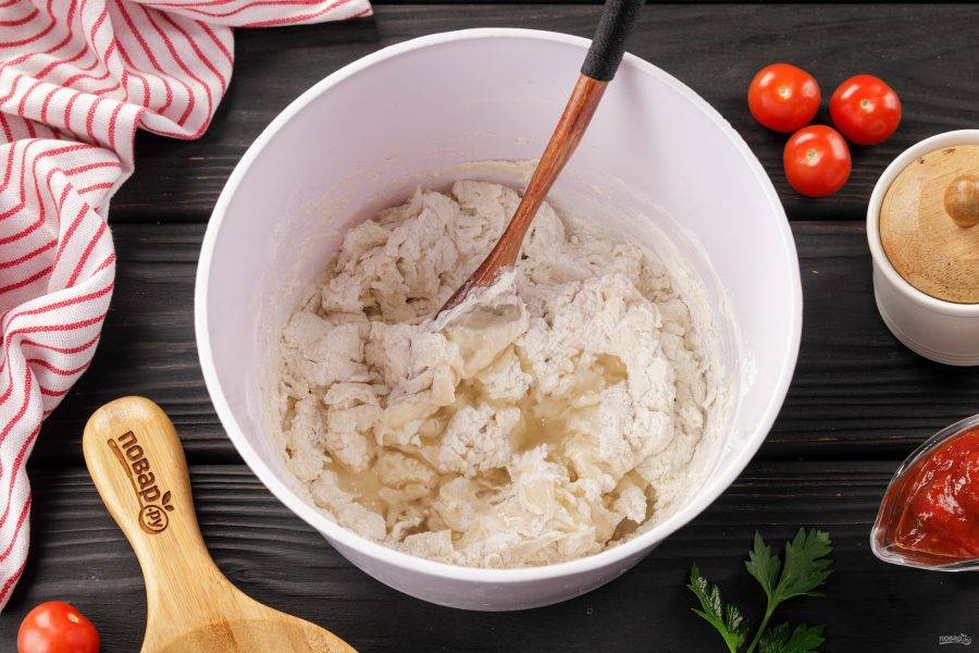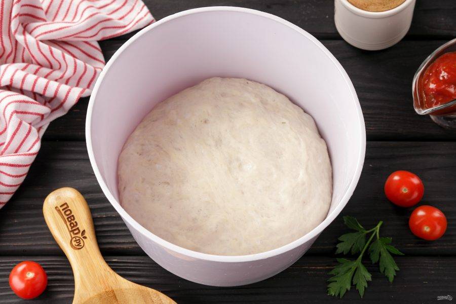 Затем руками замесите мягкое и чуть липкое тесто. Если тесто сильно липнет к рукам, можете добавить ещё чуть-чуть муки. Накройте миску с тестом полотенцем и оставьте примерно на 1-1,5 часа для подъёма.