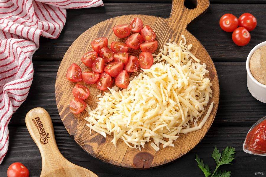 Черри помойте и разрежьте на 2-4 части, сыр натрите на крупной тёрке.