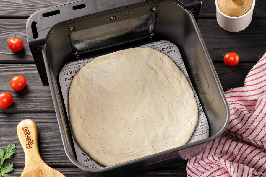 Пиццу можно готовить прямо на решётке, смазав её растительным маслом или в силиконовой форме. Я использую пергамент. Раскатайте одну часть теста скалкой под диаметр формы 20 см. и аккуратно перенесите. Наколите дно вилкой.