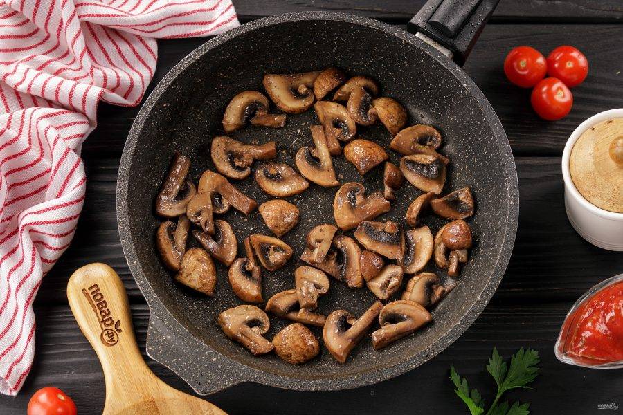 Шампиньоны нарежьте пластинами и обжарьте до испарения жидкости, в конце добавьте соль по вкусу.