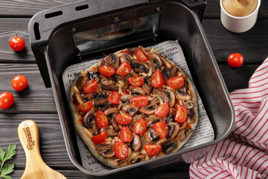 Попробуйте приготовить пиццу в аэрогриле по этому рецепту. Она конечно получается небольшая по диаметру, но очень нежная и вкусная. Начинку можно сделать любую, у меня сегодня грибы и черри.