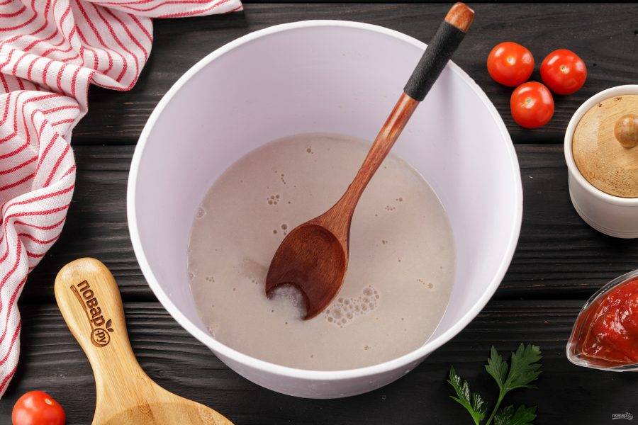 В глубокой миске соедините тёплую воду, сахар и дрожжи. Перемешайте и оставьте на 10 минут.