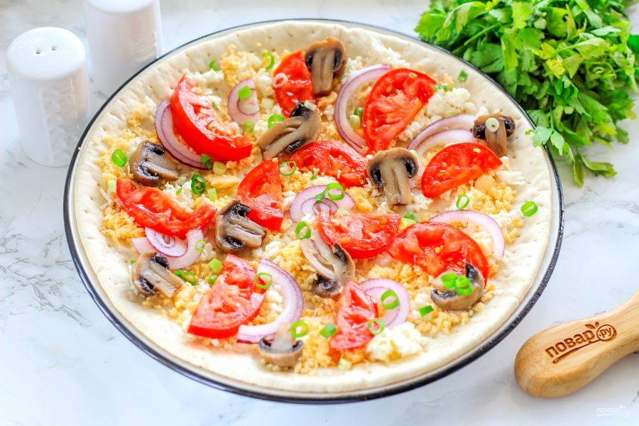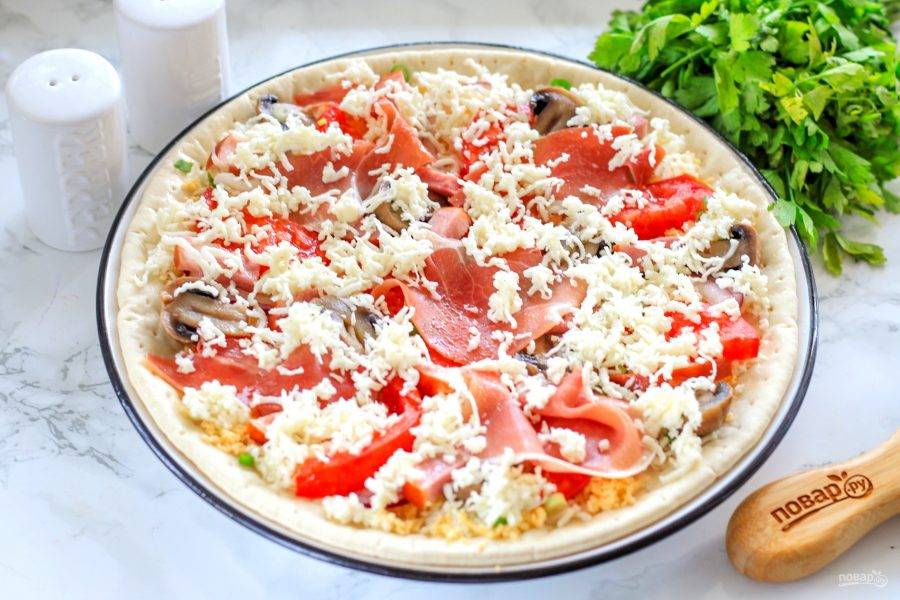 Выложите оставшуюся натертую моцареллу. Так как сыр рассольный, то заготовку лучше не солить! Прогрейте духовку до 220 градусов и испеките пиццу в течение 10-12 минут до румяности.