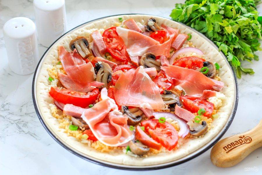 Нарежьте брусочками или кубиками ветчину и выложите ее на основу вместе с ломтиками прошутто.