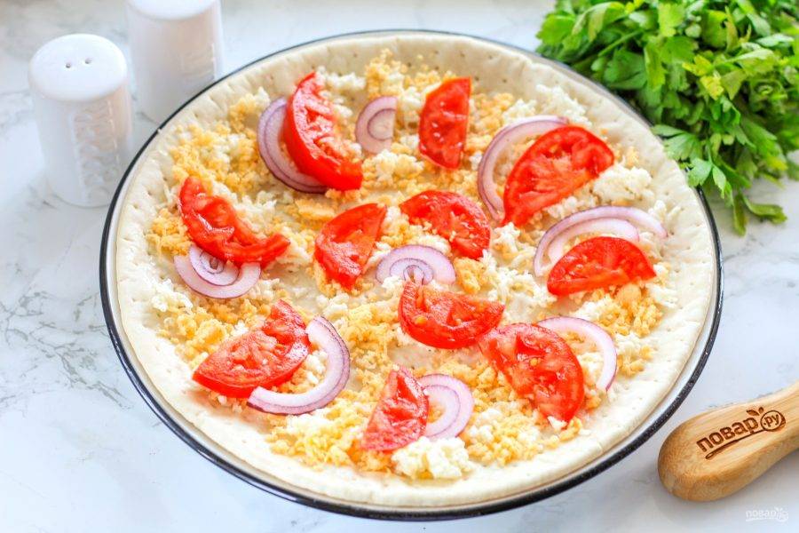 Основу для пиццы слегка разморозьте и присыпьте половиной натертой моцареллы. Натрите твердый сыр на терке с мелкими ячейками и тоже присыпьте сверху. Промойте помидоры и нарежьте кружочками, брусочками и т.д. Нарежьте красный лук полукольцами. Выложите на натертый сыр.