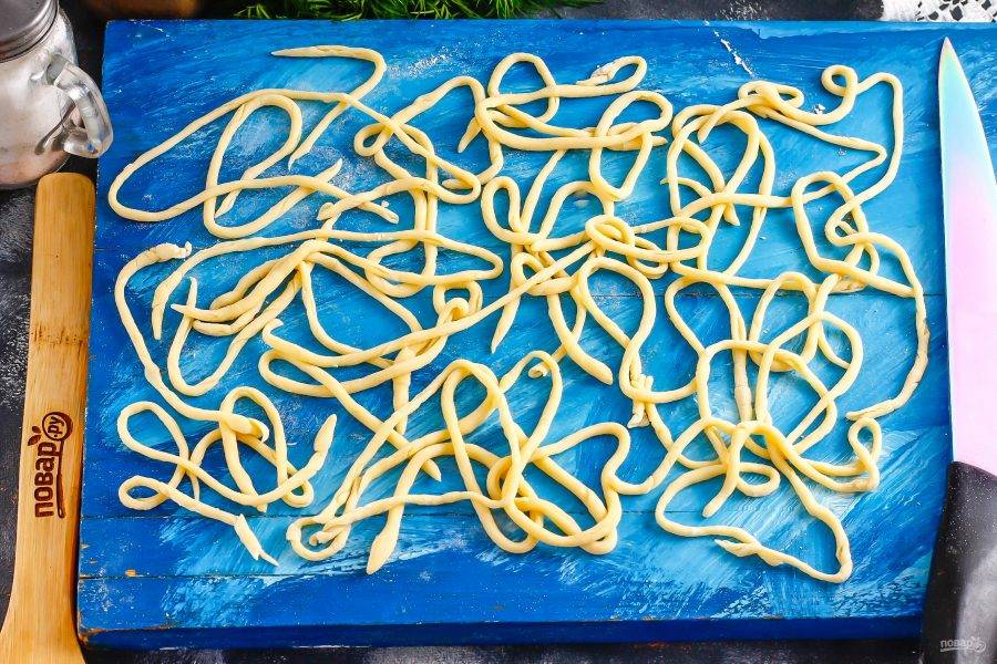 Обмакните руки в муку и скатайте каждую полоску в руках, округляя ее.