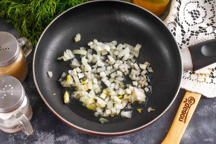 В это время нарежьте очищенную половину репчатого лука мелкими кубиками и отпассеруйте в растительном масле примерно 2-3 минуты.