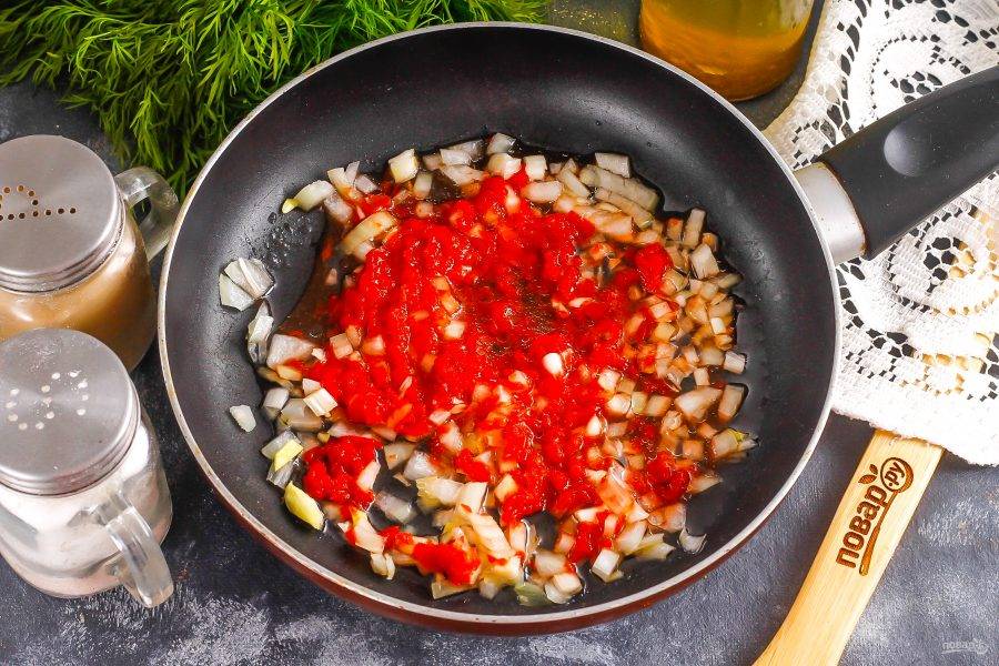 Добавьте молотый чеснок, соль и пасту из помидоров или из перца. Потушите примерно 1-2 минуты.