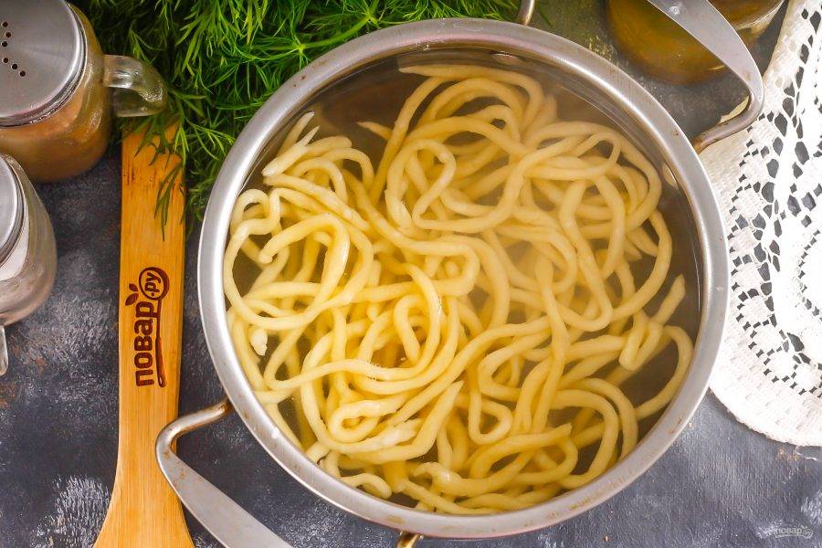Вскипятите воду и отварите в ней приготовленную пасту, выкладывая ее в жидкость по одной. Время варки — 8-10 минут.