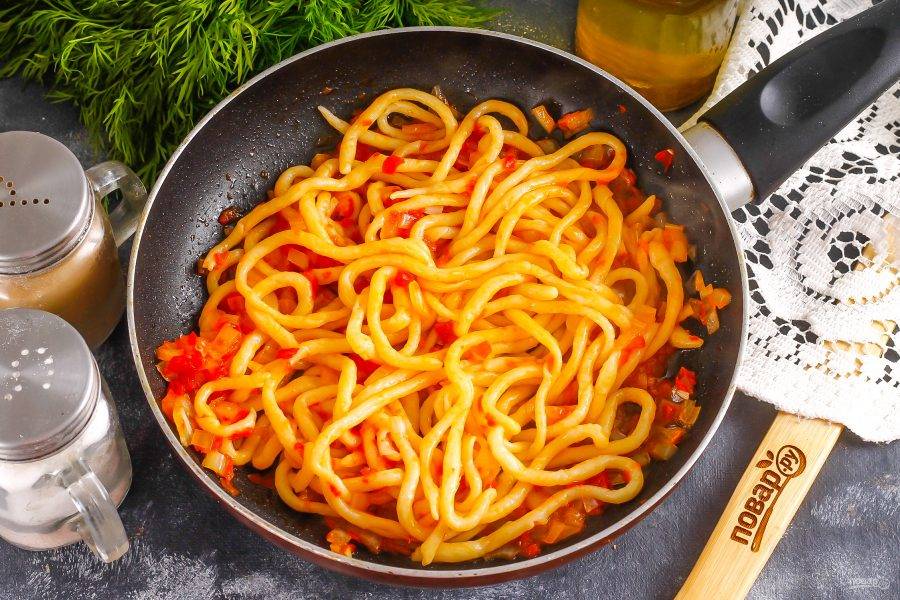 Выложите в соус отваренную пасту. Можно добавить немного сушеного или свежего базилика. Перемешайте и прогрейте примерно 1 минуту.