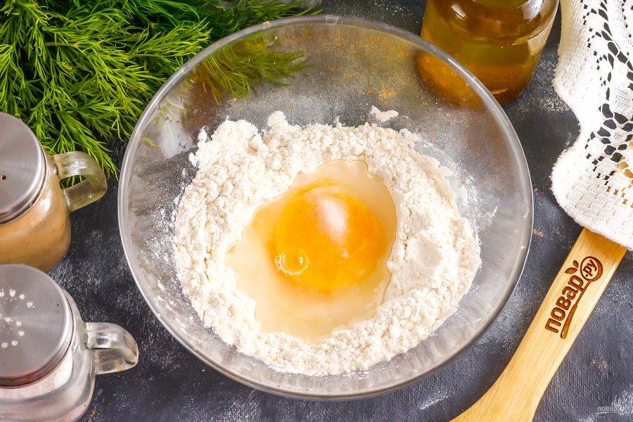 Всыпьте в глубокую миску пшеничную муку высшего сорта, оставив 2 ст.л. на раскатку теста. Сделайте в муке углубление, всыпьте туда 2 щепотки соли, вбейте куриное яйцо и влейте воду.