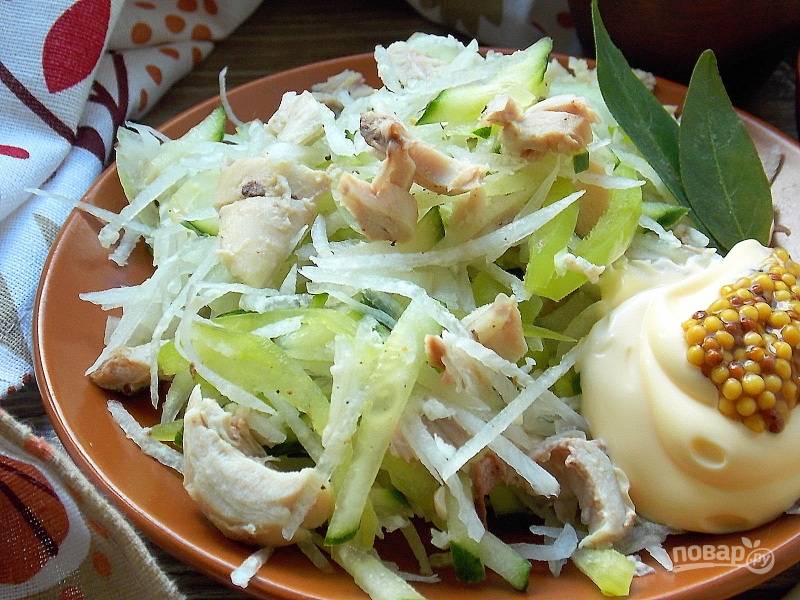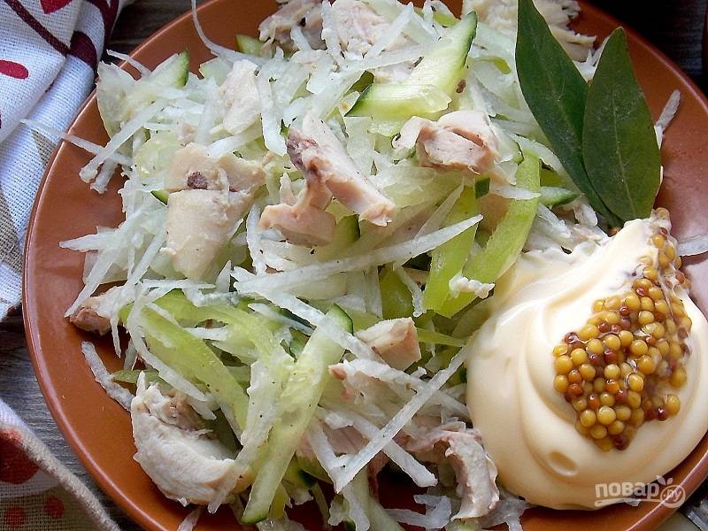 Легкий мясной салат подойдет на ужин для тех, кто следит за своей фигурой. Чтобы салат не получился сухим, его дополняет рубленый дайкон. Он придает свежести и сочности, прекрасно сочетаясь с мясом.