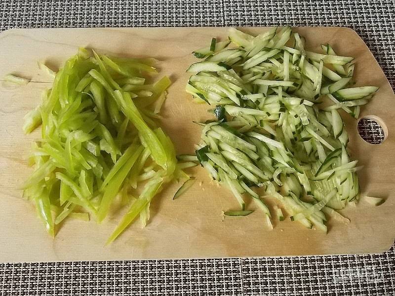 нарежьте тонкой соломкой огурец и очищенный перец.