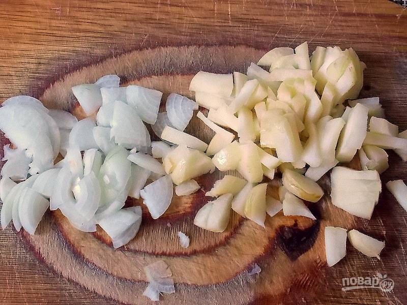 Порежьте соломкой лук и яблоко.