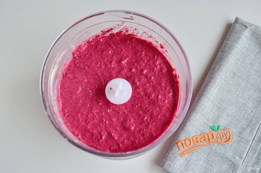 Свеклу и селедку порежьте на несколько частей, сложите все ингредиенты (кроме желатина) в измельчитель. Включите технику на 4-5 минут.