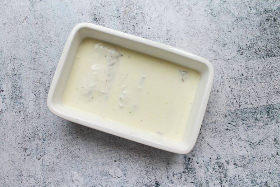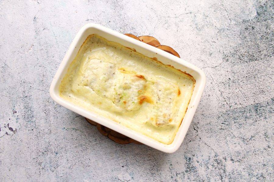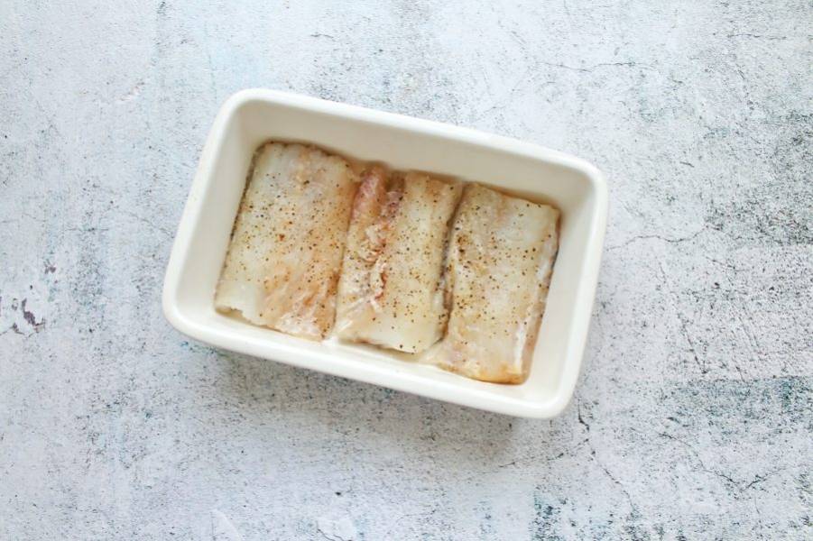 Филе сполосните, обсушите бумажным полотенцем и разрежьте на порционные куски. Рыбу посолите, поперчите и выложите в форму, смазанную растительным маслом.