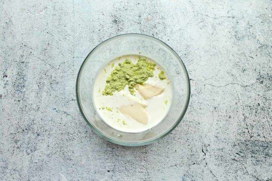 В чашку налейте сливки, добавьте васаби, лимонный сок, измельченный чеснок и сливочное масло. Немного нагрейте на водяной бане, чтобы масло растаяло и перемешайте.