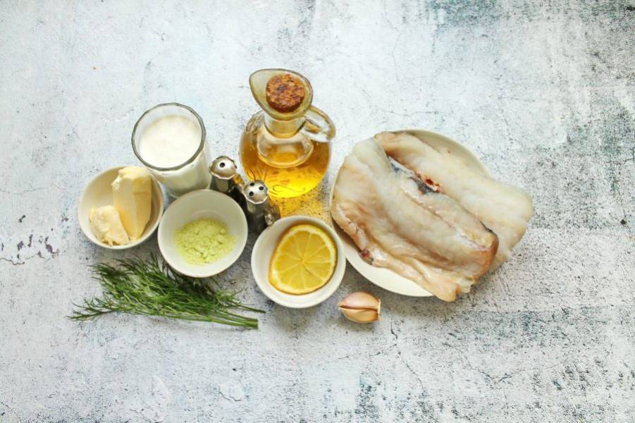 Подготовьте все необходимые ингредиенты для приготовления пикши в сливочном соусе.