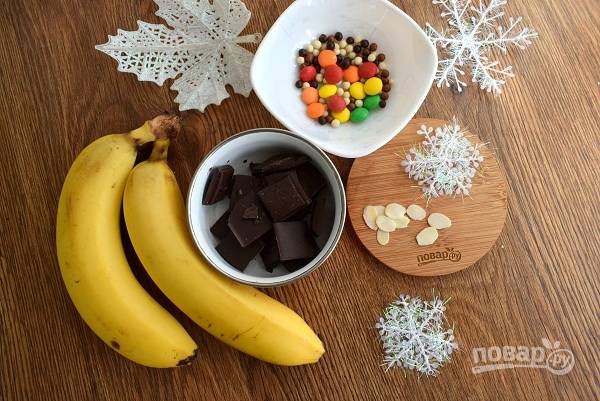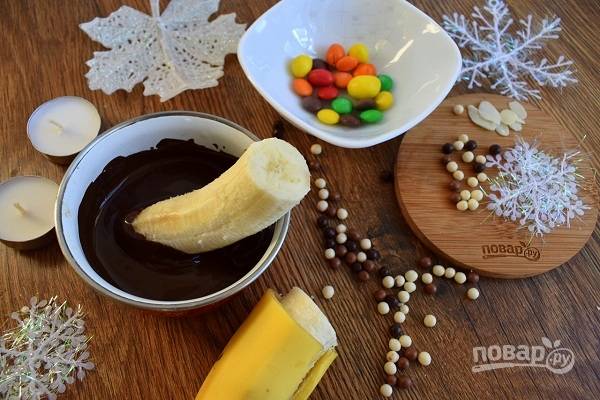 Растопите шоколад на водяной бане. Дайте немного остыть, чтобы шоколад не растекался по банану. Очистите бананы, разрежьте на две половинки. Окуните острым кончиком в шоколад, дайте немного застыть, поставьте срезом на тарелку, нанесите растопленный шоколад на место для ног пингвина.