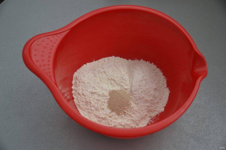 Всыпьте в емкость для замешивания теста всю муку и сухие дрожжи, смешайте.
