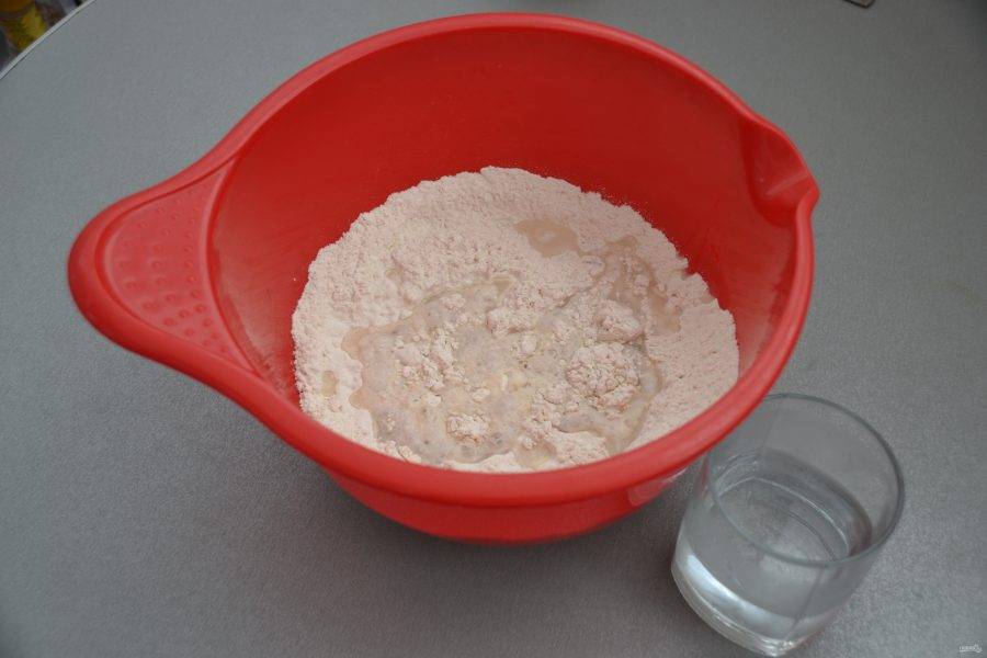 Влейте в муку ледяную воду, часть воды (примерно пятую часть) оставьте.