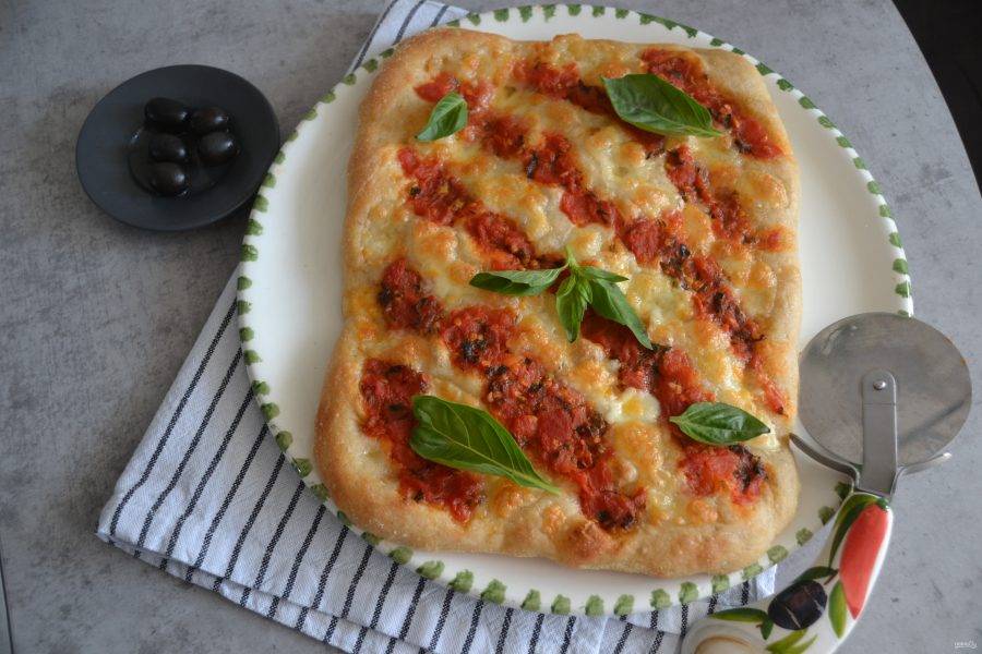 Способ второй. Точно так же подготовить тесто, сделать пальцами вмятинки, сбрызнуть оливковым маслом и предварительно подпечь при температуре 200 градусов около 10 минут.