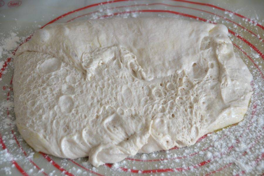 Через сутки присыпьте рабочую поверхность стола семолиной (или манкой) и аккуратно выложите тесто на стол.