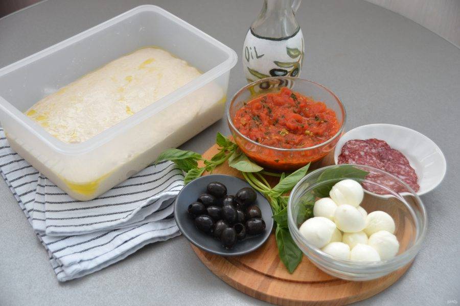 Подготовьте ингредиенты для приготовления пинсы. К этому моменту должно быть готово тесто. О том, как его приготовить в следующем шаге.