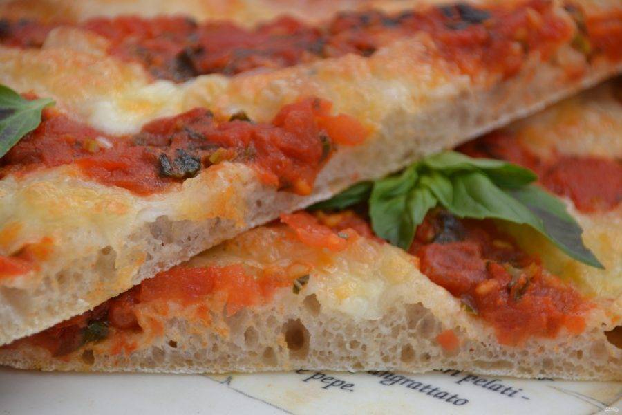 В разрезе можно видеть, что тесто у пинсы с большим количеством дырочек, хрустящее, тонкое с краев с утолщением к центру.