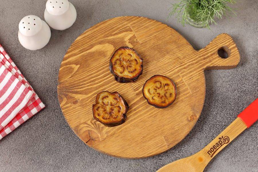 Обжарьте баклажаны с двух сторон на сковороде до готовности, а затем выложите на бумажное полотенце, чтобы убрать излишки масла.