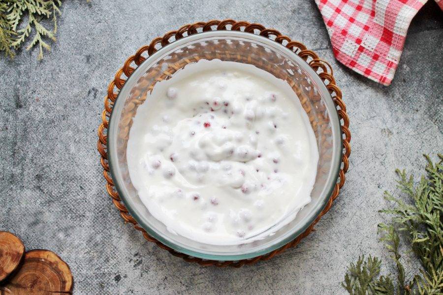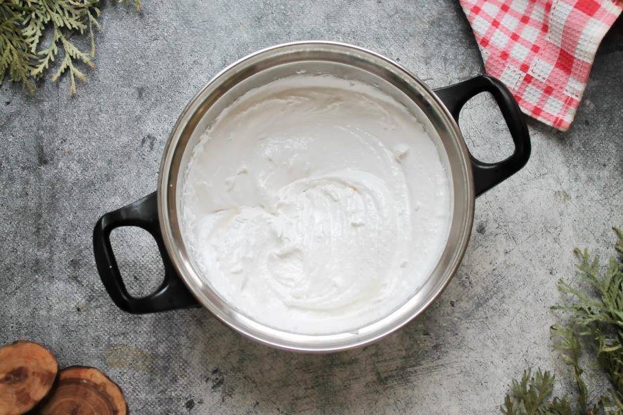 Аккуратно перемешивая белки, введите сметану и перемешайте до однородности.