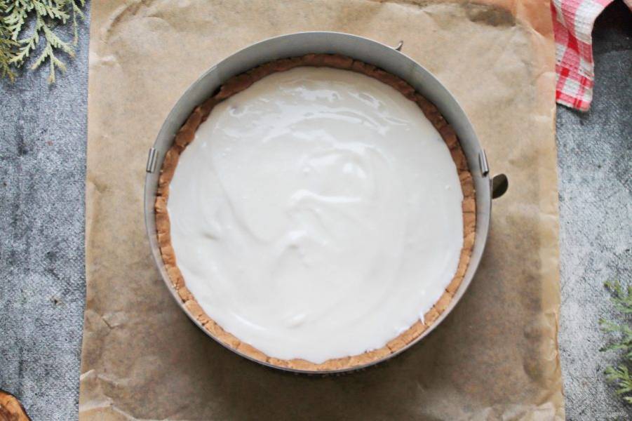 Противень застелите пергаментом, установите кондитерское кольцо с высокими бортиками диаметром 18 сантиметров. Положите тесто и распределите его по дну и бортикам формы.