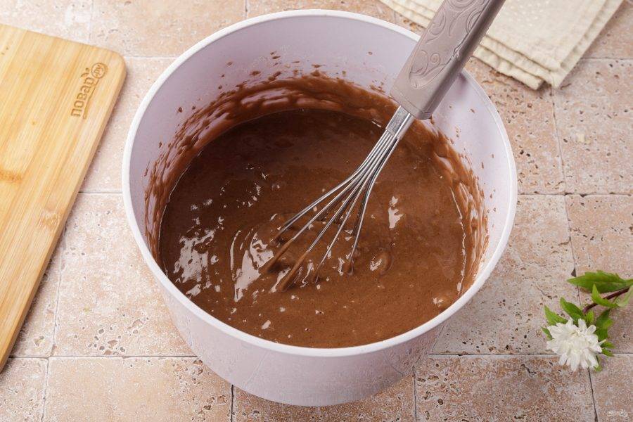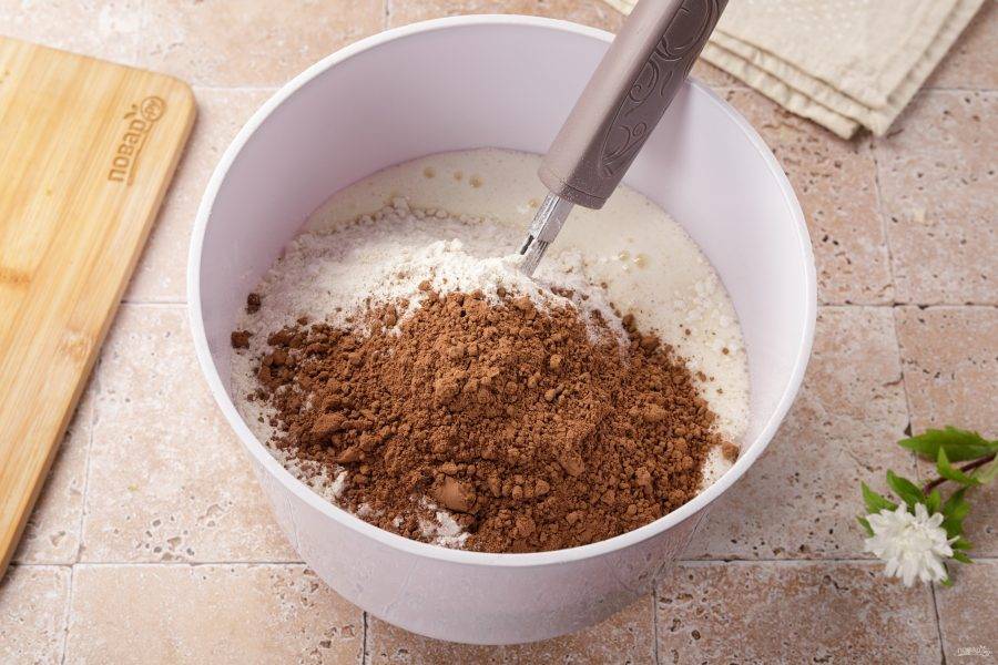 Затем добавьте кефир, муку, какао и соду.